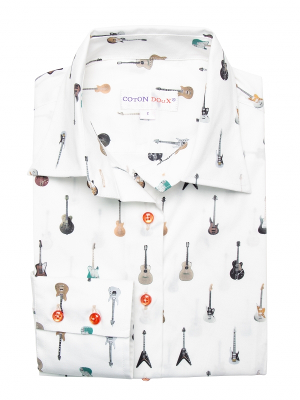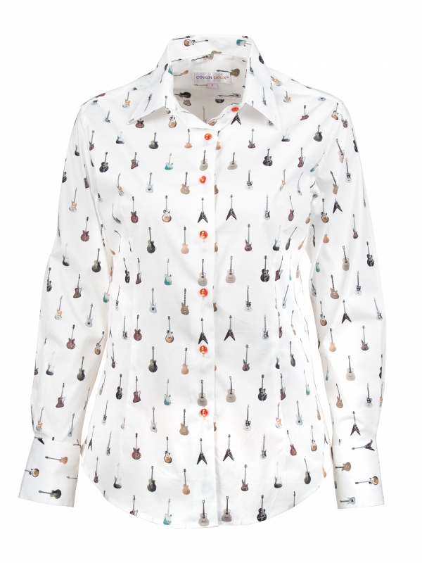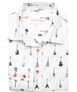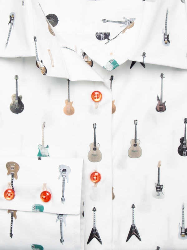 Elevate your musical style with this guitar-print shirt that will turn every day into a fashion symphony! Featuring a classic collar and double-button cuffs, this shirt has a tailored fit for harmonious elegance. To add a note of passion and rhythm to your ensemble, pair it with black slim jeans and brown leather boots adorned with studs. Express yourself fully by wearing a black leather jacket with silver details for a rock look that lets your style play the melody of your personality!