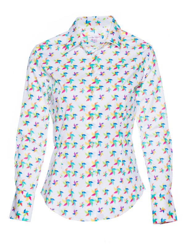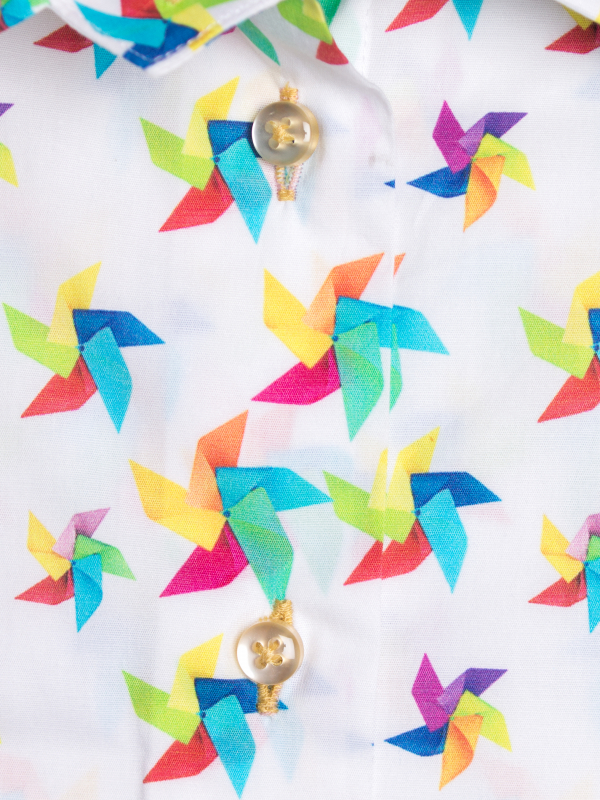 Let the wind of style blow on this slim fit shirt with windmill print. Its vividly colorful touches on the white background will brighten up any outfit, for example mustard trousers and sandals. Its classic collar and double-button cuffs will give you a burst of elegance!