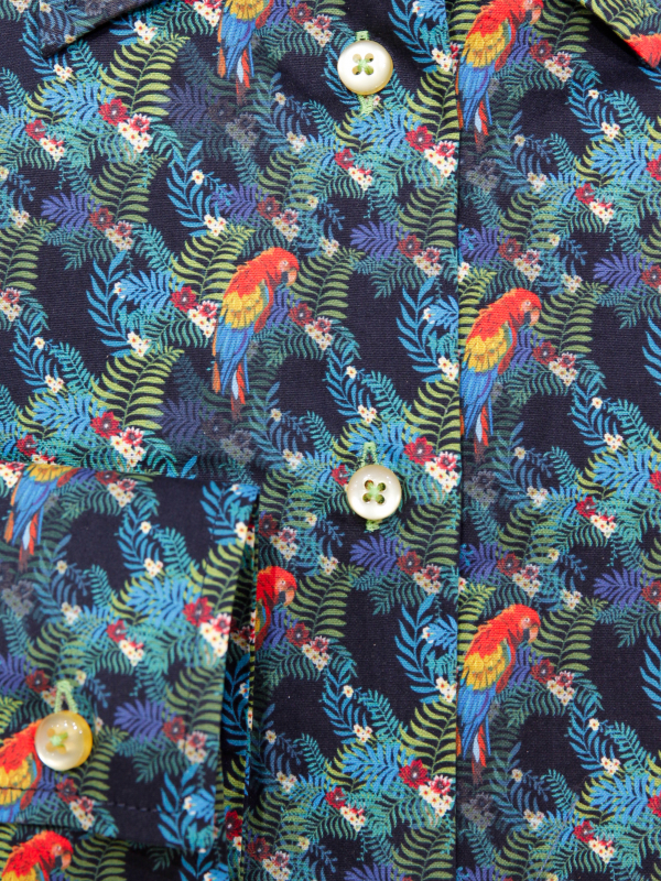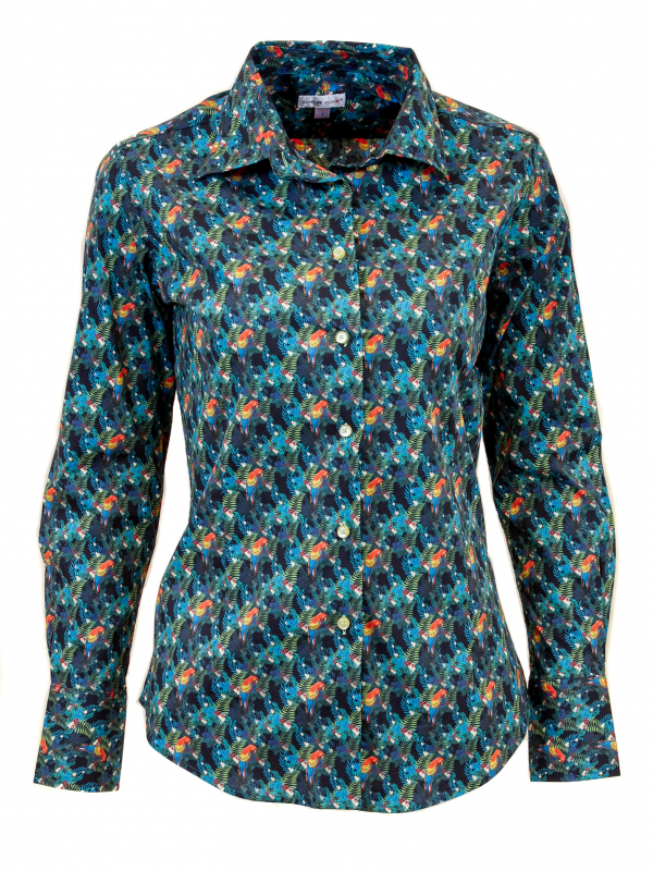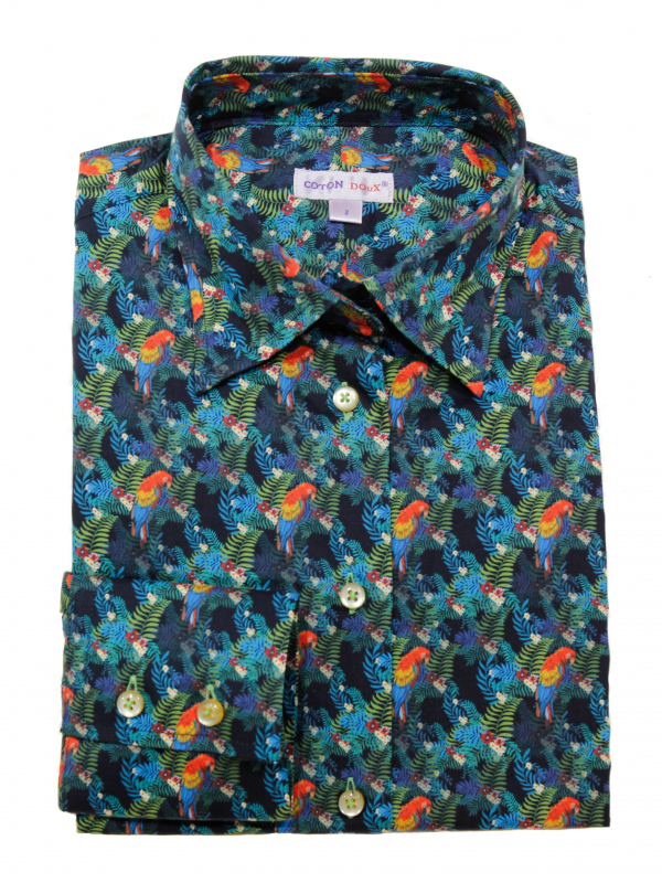 You love parrots? So this brightly colored parrot print blouse with a slim fit will take you to the rainforest. Its classic collar and double button cuffs will be chic to wear.