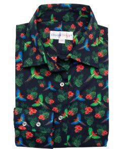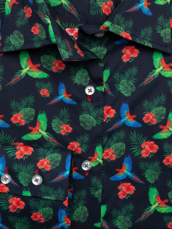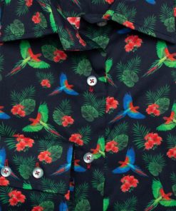 Dreaming of traveling to colorful horizons? Brighten your days with this parrot-print shirt that will provide you with a taste of adventure and whimsy. Featuring a classic collar and double-button cuffs, this shirt showcases a tailored fit to bring out a tropical and sunny ambiance. To add a touch of escapade, opt for olive corduroy pants and brown leather ankle boots with fringe details. You’ll be ready for a tropical escapade, even without leaving your daily routine!