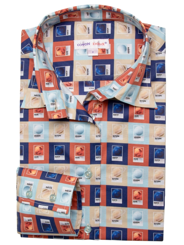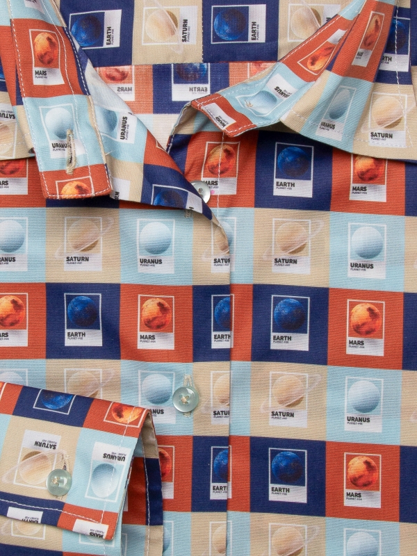 Embark on an intergalactic adventure with our planets print shirt, showcasing a mesmerizing array of celestial bodies each with its own vibrant allure. The classic collar and double-button cuffs lend a touch of classic elegance, while the slim fit ensures a contemporary, streamlined silhouette. Perfect for adding a cosmic twist to your wardrobe, pair this shirt with dark wash jeans and sleek sneakers for a modern, space-inspired look. Elevate your style to new heights with this stellar design that’s out of this world.
