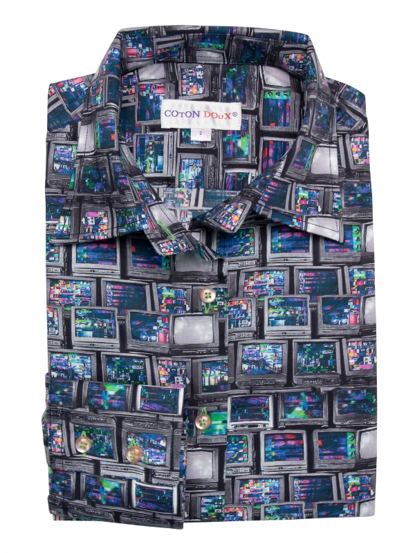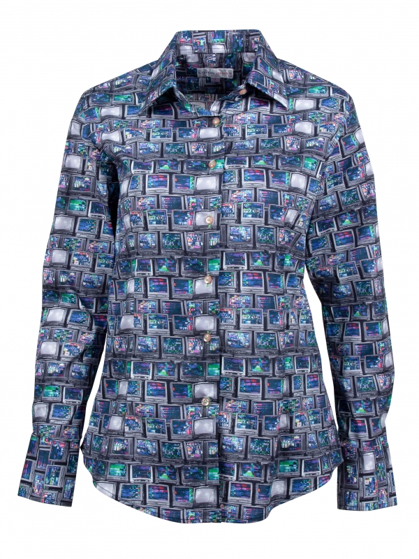 Relive waves of nostalgia with this television-print shirt ! Featuring a classic collar, double-button cuffs, and a tailored fit, it blends modernity with a vintage spirit. For the outfit, pair it with a black leather skirt for a bold and trendy look, leather ankle boots for a retro touch, and top it off with a denim bomber jacket for that extra flair. Ready for a journey through time?