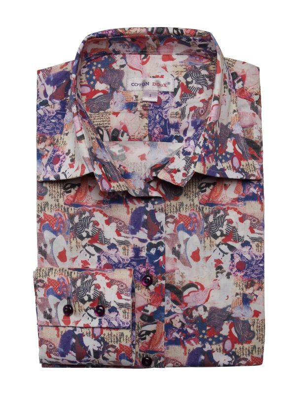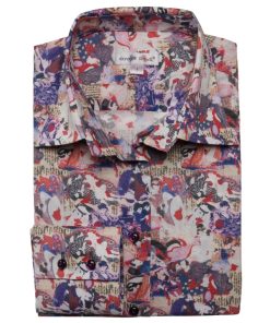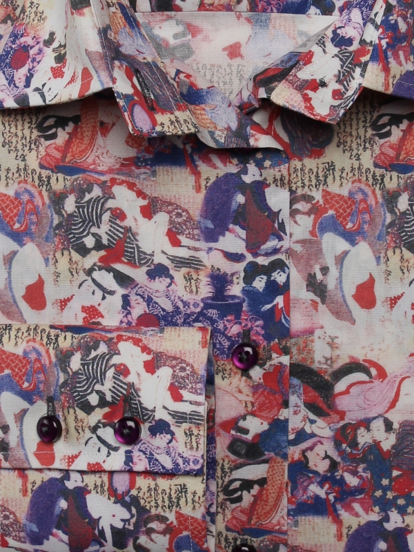 By adding this Japanese print shirt to your wardrobe you will enjoy looking at it like a work of art. You’ll become a work of art yourself with its classic collar and double button cuffs as soon as you wear it.For a successful display, pair this slim fit shirt with light brown straight pants and a pair of retro black babies. We guarantee an immediate effect!