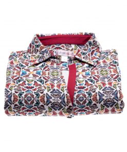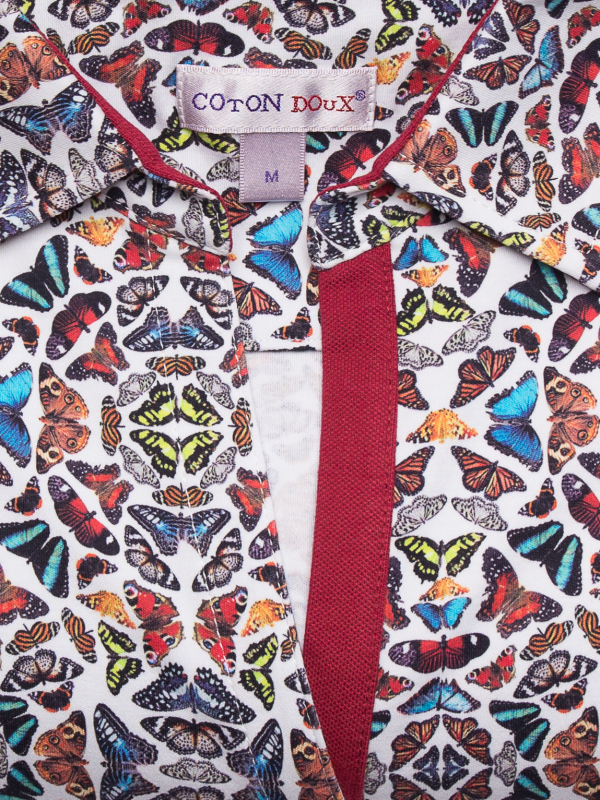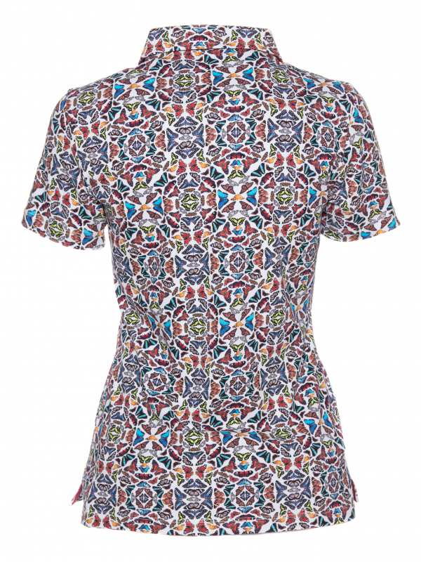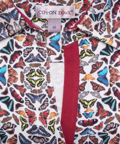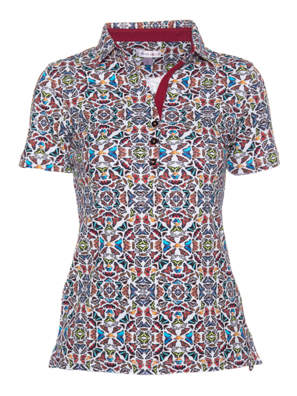 Wait a minute ! Take the time to observe the details of this polo shirt : slim fit, triple buttons and cotton piqué collar… In addition to these worked finishes, for a maximum comfort, you will appreciate the design and the optical effect of its multicolored butterfly print. On a raw denim skirt and a pair of brown spartans shoes you will just have to appreciate its softness thanks to its cotton jersey.