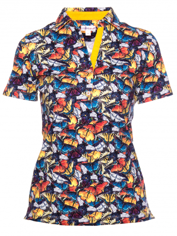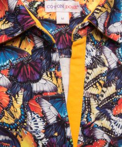 This butterfly print polo will ensure you a style full of colors, for winter as well as summer, thanks to the different shades and the mercerized cotton jersey. Its orange piqué cotton collar and three-button placket will nicely contrast with navy blue chino pants or jeans. And you will love wearing its slim cut.