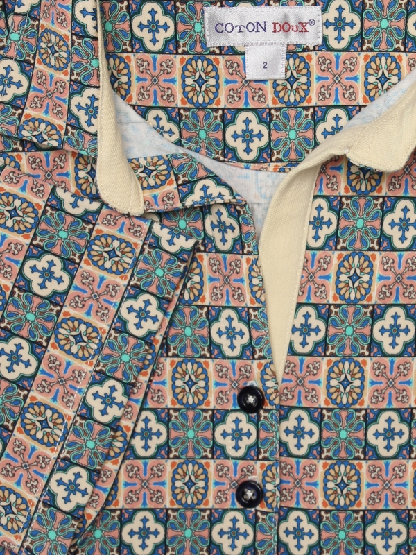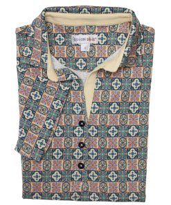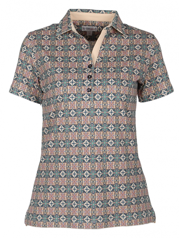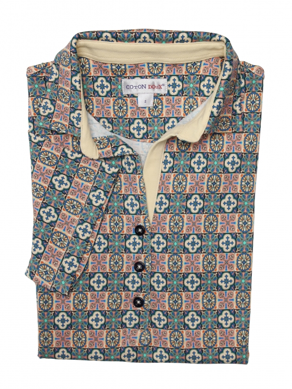 Whether using opus regulanum to obtain an aligned look or even opus palladianum to observe a real dynamism, this art crosses the ages! Its mercerised cotton jersey composition and cotton piqué collar will give you a refined and elegant look. They will highlight the mosaic print and its beige tones. The slim fit and three-button placket will look great with a navy blue suit and a pair of heels.