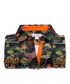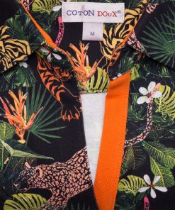 The jungle is trendy! The tiger and flowers print will give a touch of tropical feelings for your outfit. Match this slim fitted polo shirt with black jeans and orange espadrilles in order to play with the color of the cotton piqué collar. Other details are the slim fit cut,three-button placket and made with jersey of cotton. The perfect look for the hot days!