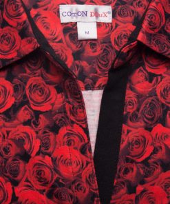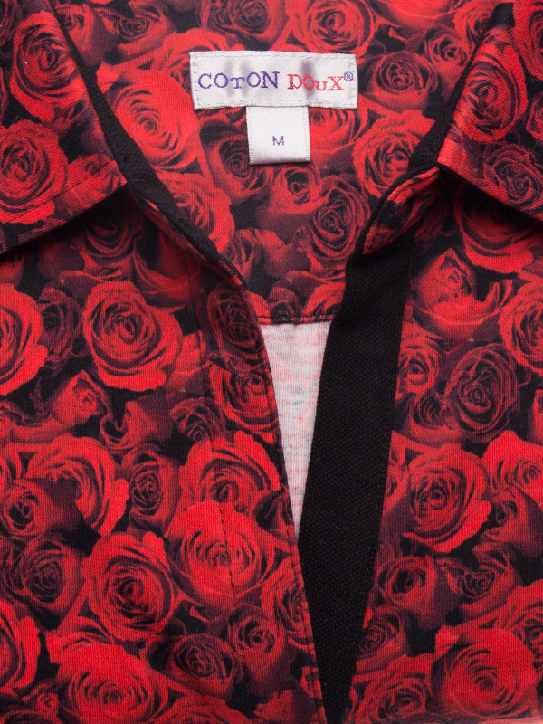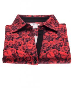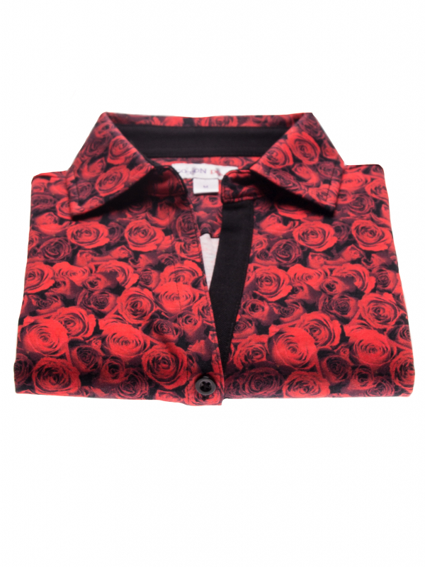 Make this red roses print your best asset with this kissing short sleeved polo shirt. Its mercerized cotton jersey and three-button placket will make it charming and casual while its plain piqué cotton collar will give it elegance. Black skirt and pumps will sublimate everything for a most fatal style!